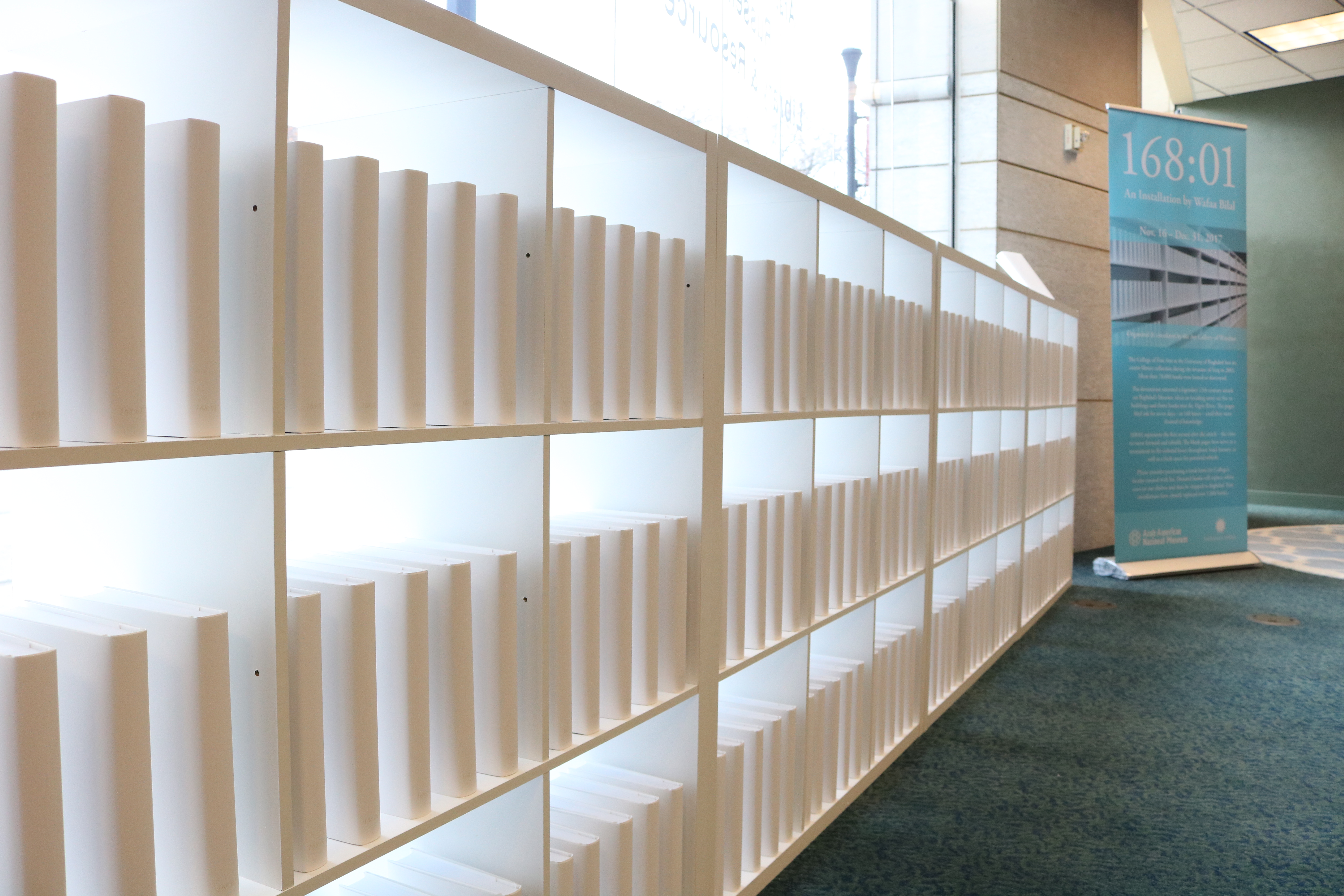 In the installation 168:01, acclaimed artist Wafaa Bilal has constructed an austere library containing only blank white books. The white library serves as both a monument to the staggering cultural losses endured throughout Iraq’s history as well as a platform for its rebirth. Aimed at restoring the college’s lost archives, 168:01 positions viewers as potential participants whose contributions fund educational texts from a wish list compiled by students and faculty.