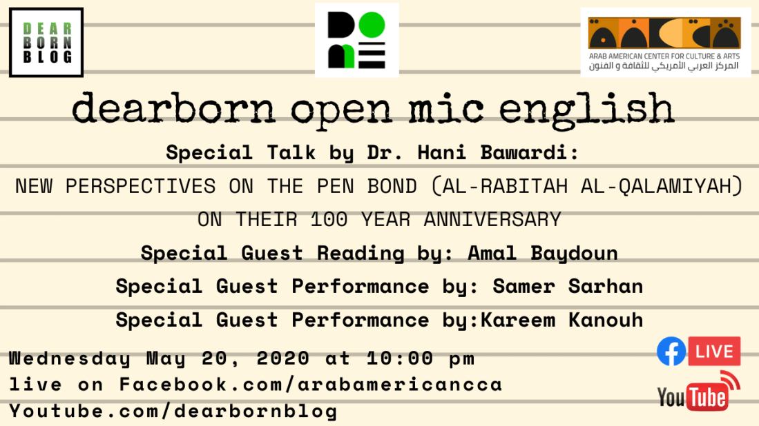 Arab American Center for Culture and Arts invite you for another night of poetry, music, and culture with the Dearborn Open Mic English (DOME) at 10PM on the third Wednesday of each month. This episode on May 20, 2020, will feature a talk by Professor Dr. Hani Bawardi titled “New Perspectives on the Pen Bond (AlRabitah AlQalamiyah) on Their 100 Year Anniversary”. It will also feature poetry from Amal Baydoun for the first time. Other poets will participate in the open forum. There will be a special live performance by Samer Sarhan and Kareem Kanouh. Please click Reminder and feel free to jump in and participate during the program open mic section.