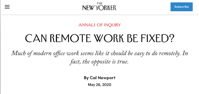 Earlier today, I published my latest article for the New Yorker. It’s titled: Can Remote Work Be Fixed?
