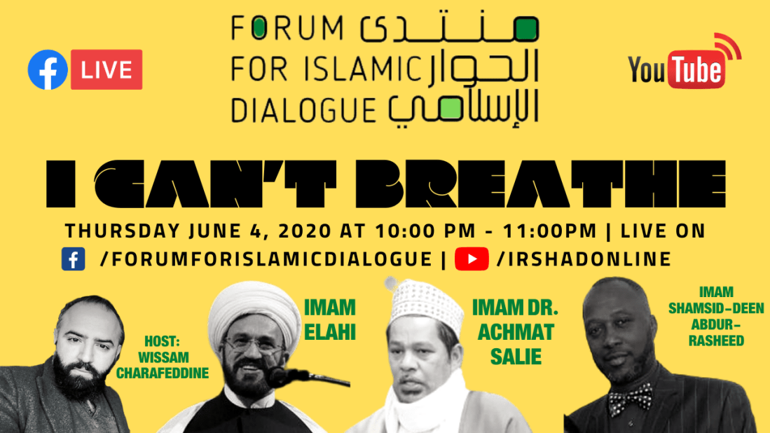 Forum for Islamic Dialogue presents a discussion about Anti-Black Racism in America titled “I Can’t Breathe” hosted by Wissam Charafeddine, and guests are: Imam Elahi: the spiritual leader of the Islamic House of Wisdom (IHW) in Dearborn Heights, one of the largest religious institutions in the state of Michigan. Imam Dr. Achmat Salie: a renowned academic expert and speaker on Social Justice and Islamic studies. Imam Shamsid-deen Abdur-rasheed: Islamic Studies teacher and High School Math teacher, activist, and preacher.