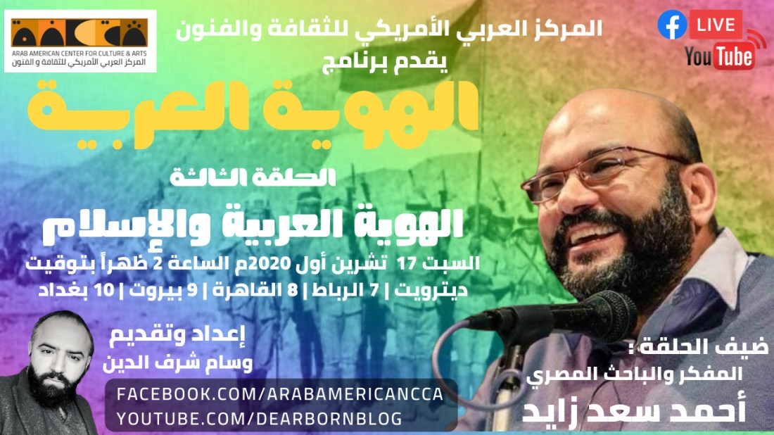 يتشرف المركز العربي الأمريكي للثقافة والفنون بدعوة الأستاذ المفكر والباحث المصري أحمد سعد زايد للإجابة على هذه الأسئلة في الحلقة الثالثة من الهوية العربية … يعد البرنامج ويدير الحوار السيد وسام شرف الدين.ـ