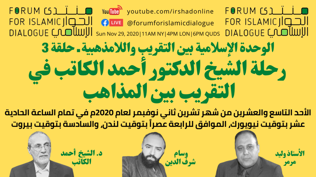 يتشرف منتدى الحوار الإسلامي بدعوتكم لحضور الحلقة الثالثة من سلسلة الوحدة الإسلامية بين التقريب واللامذهبية و نستضيف فضيلة الشيخ الدكتور أحمد الكاتب يحاوره الأستاذ وليد مرمر، والسيد وسام شرف الدين يوم الأحد التاسع والعشرين من شهر تشرين ثاني نوفمبر لعام 2020م في تمام الساعة الساعة الحادية عشرصباحاً بتوقيت نيويورك، الموافق للرابعة عصراً بتوقيت لندن، والسادسة بتوقيت بيروت