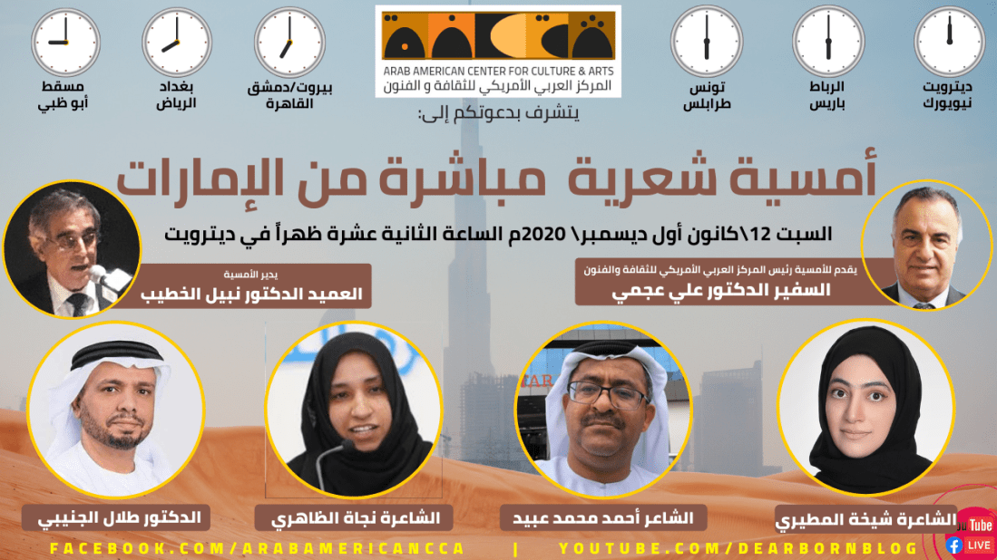 يتشرف المركز العربي الاميركي للثقافة والفنون بدعوتكم إلى أمسية شعرية مباشرة من الامارات العربية المتحدة، ويشارك فيها كل من: الشاعر الدكتور طلال الجنيبي الشاعرة نجاة الظاهري الشاعر احمد محمد عبيد والشاعرة شيخة المطيري يقدم للأمسية السفير الدكتور علي عجمي ويدير الأمسية العميد الدكتور نبيل الخطيب الزمان: السبت في 12 كانون الاول(ديسمبر) 2020 الساعة الثانية عشرة ظهرا بتوقيت ديترويت، السابعة مساء بتوقيت بيروت، التاسعة ليلا بتوقيت الامارات