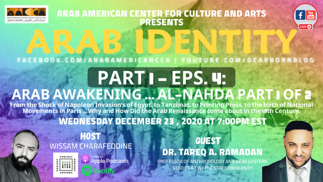 Arab American Center for Culture and Arts present Arab Identity Part 1 – Episode 4 – Arab Awakening (AlNahda) Part 1 of 2 with Guest Dr. Tareq A. Ramadan. AlNahda, also referred to as the Arab Renaissance or Enlightenment, was a cultural movement that flourished in Arabic-speaking regions of the Ottoman Empire, notably in Egypt, Lebanon and Syria, during the second half of the 19th century and the early 20th century. In traditional scholarship, the Nahda is seen as connected to the cultural shock brought on by Napoleon’s invasion of Egypt in 1798, and the reformist drive of subsequent rulers such as Muhammad Ali of Egypt. However, more recent scholarship has shown the Nahda’s cultural reform program to have been as “autogenetic” as it was Western-inspired, having been linked to the Tanzimat—the period of reform within the Ottoman Empire which brought a constitutional order to Ottoman politics and engendered a new political class—as well as the later Young Turk Revolution and the birth of Arab national movements, allowing proliferation of the press and other publications and internal changes in political economy and communal reformations in Egypt and Syria and Lebanon. Joining us to discuss AlNahda and why is it important to know about it today in shaping our Arab Identity, and how can it inspire us for the future, Dr. Tarek Ramadan. Dr. Tareq A. Ramadan is an interdisciplinary professor of Anthropology and Near Eastern Studies and regularly teaches courses in Middle Eastern, Arab and Islamic history, society, politics, and culture at Wayne State University and Henry Ford College.