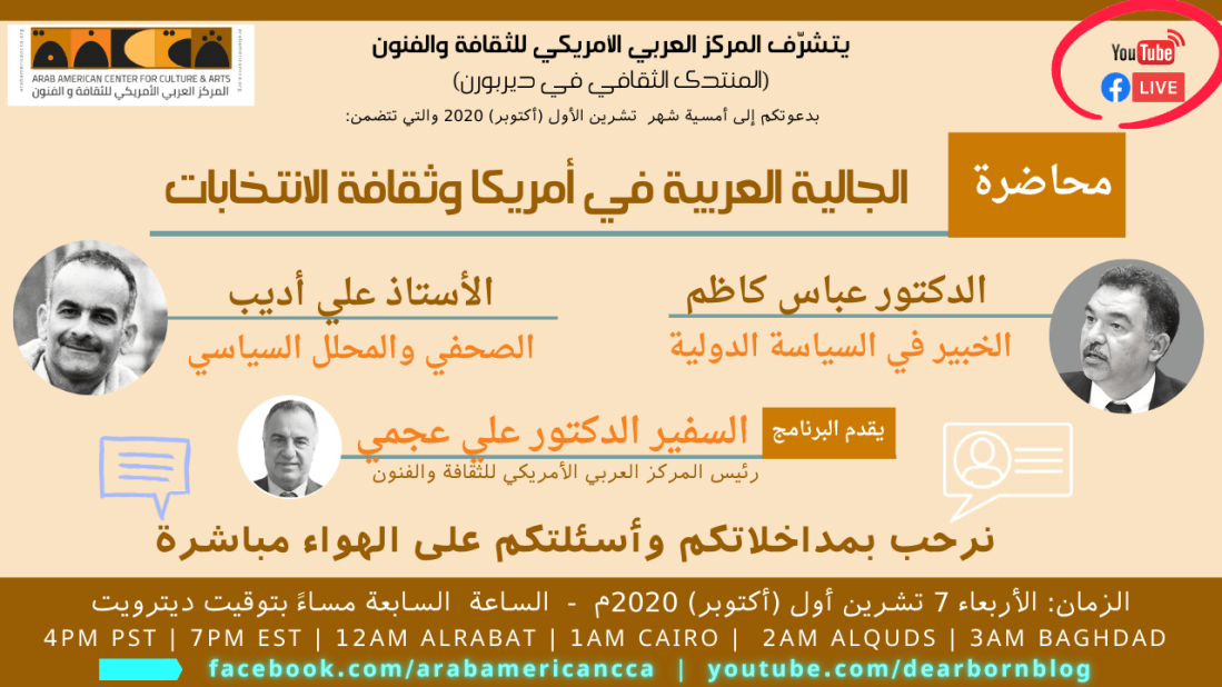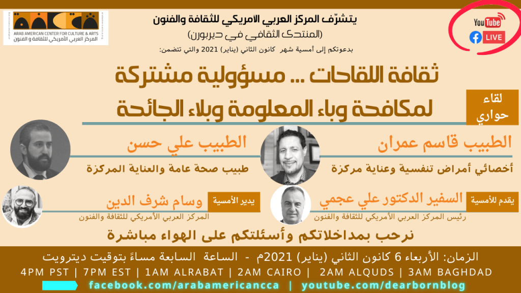 يتشرف منتدى ديربورن الثقافي والمركز العربي الأمريكي للثقافة والفنون دعوتكم للحضور افتراضيا في الأمسية الاولى للسنة الجديدة ٢٠٢١م أول أمسية للعام الجديد مخصصة لنشر التثقيف الصحي لأبناء الجالية، وتحت عنوان: ثقافة اللقاحات مسؤولية مشتركة لمكافحة وباء المعلومة وبلاء الجائحة *يشارك في الأمسية كل من: * ١ الطبيب قاسم عمران: أخصائي أمراض تنفسية، وعناية مركزة ٢ الطبيب علي حسن: أخصائي … يقدم للامسية: السفير الدكتور علي عجمي *يدير الأمسية: * الأستاذ وسام شرف الدين *الزمان: * يوم الأربعاء ٦ يناير (كانون الثاني) ٢٠٢١م *الوقت: * الساعة السابعة مساء بتوقيت ديترويت وواشنطن، الساعة الرابعة مساء بتوقيت لوس انجلوس
