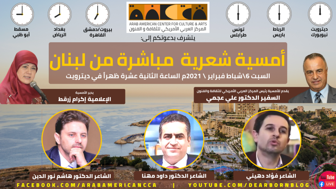 يتشرف المركز العربي الاميركي للثقافة والفنون بدعوتكم إلى أمسية شعرية مباشرة من لبنان، يشارك فيها كل من: الشاعر فؤاد دهيني والشاعر الدكتور داوود مهنا الشاعر الدكتور هاشم نور الدين يقدم للأمسية السفير الدكتور علي عجمي وتديرها السيدة إكرام زرقط الزمان: السبت في السادس من شهر شباط (فبراير) الساعة الثانية عشرة ظهرا بتوقيت ديترويت، السابعة مساء بتوقيت بيروت