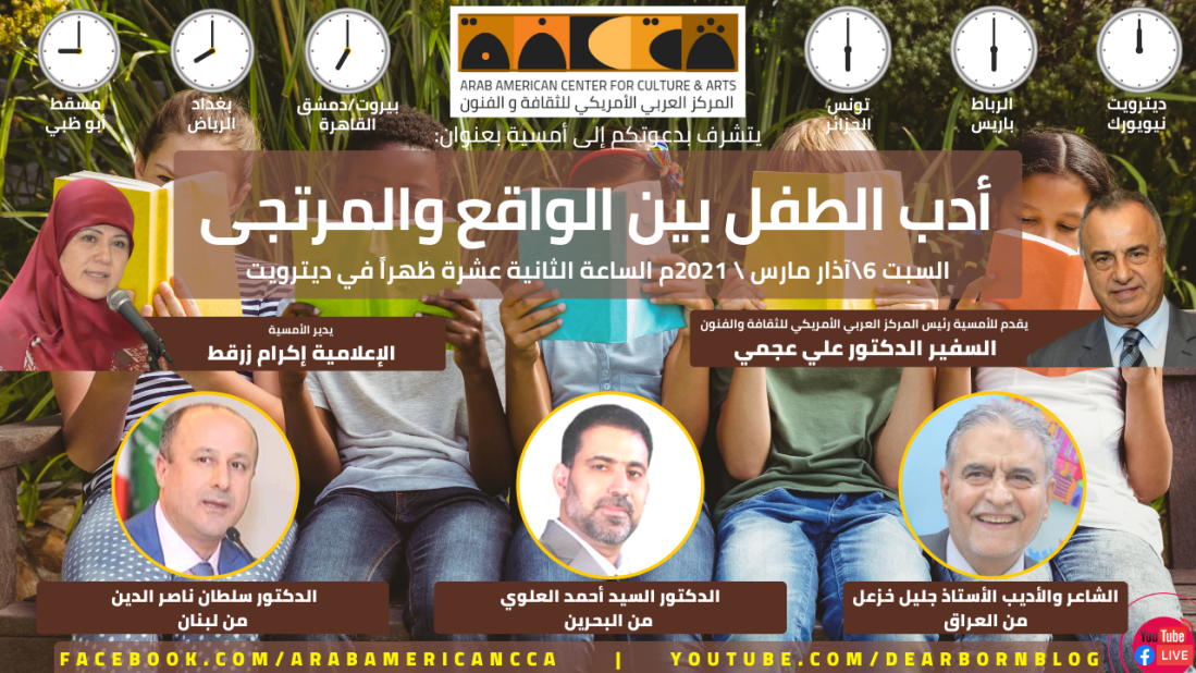 يتشرف المركز العربي الاميركي للثقافة والفنون بدعوتكم إلى أمسية بعنوان: أدب الأطفال بين الواقع والمرتجى يشارك فيها: الشاعر والأديب الأستاذ جليل خزعل (العراق) الدكتور السيد أحمد العلوي(البحرين) والدكتور سلطان ناصر الدين (لبنان) يقدم للأمسية السفير الدكتور علي عجمي وتديرها الإعلامية السيدة إكرام زرقط الزمان: السبت في 6 آذار (مارس) 2021 الساعة الثانية عشرة ظهرا بتوقيت ديترويت، السابعة مساء في بيروت، الثامنة مساء في بغداد والمنامة