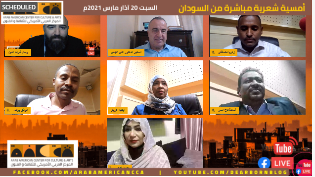 يتشرف المركز العربي الاميركي للثقافة والفنون بدعوتكم لحضور أمسية شعرية مباشرة من السودان * *ضيوف الأمسية: * *١) الشاعرة * والإعلامية الأستاذة إبتهال تريتر *٢) الشاعر * الأستاذ أسامة تاج السر أحمد حسين *٣) الشاعرة * والروائية الأستاذة مناهل فتحي حسن سالم *٤) الشاعر * والفنان التشكيلي الأستاذ الواثق يونس *يقدم للأمسية: * السفير الدكتور علي عجمي رئيس المركز العربي الاميركي للثقافة والفنون يدير الامسية: الشاعر والإعلامي السوداني الأستاذ زكريا مصطفى أحمد الحسن *الزمان: * يوم السبت في ٢٠ آذار (مارس) ٢٠٢١م *الوقت: * الساعة الثانية عشرة ظهرا بتوقيت ديترويت، السادسة مساء بتوقيت الخرطوم و بيروت، السابعة مساء بتوقيت بغداد والرياض