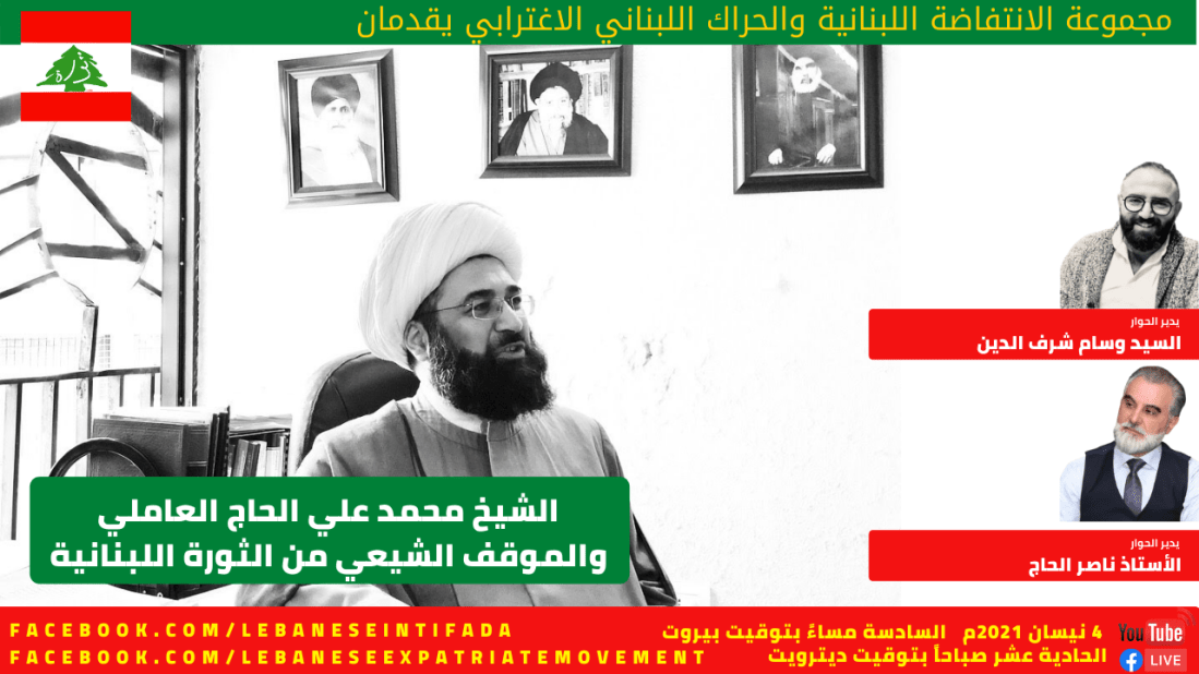 الحراك الاغترابي ومجموعة الانتفاضة اللبنانية يقدمان حواراً مع سماحة الشيخ محمد علي الحاج العاملي تحت عنوان “الموقف الشيعيا من الثورة اللبنانية” الأحد الموافق للرابع من شهر نيسان إبريل عام 2021م في تمام الساعة الحادية عشر صباحاً بتوقيت ديترويت، السادسة مساء بتوقيت بيروت. يدير الحوار الأستاد ناصر الحاج والسيد وسام شرف الدين من منصة الحراك الاغترابي في ديترويت.