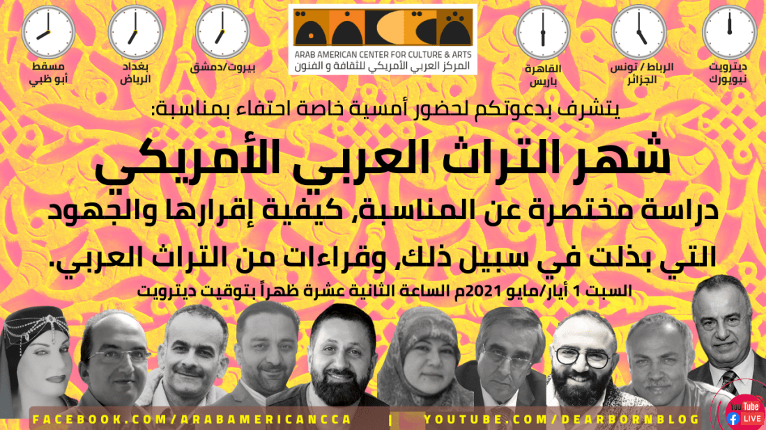 يتشرف المركز العربي الاميركي للثقافة والفنون بدعوتكم إلى أمسية خاصة احتفاء بمناسبة شهر التراث العربي الاميركي *تتضمن الأمسية؛* ١) دراسة مختصرة عن المناسبة وإطلالة على كيفية إقرارها والجهود التي بذلت في سبيل ذلك، ٢) إضافة إلى قراءات من التراث العربي. *ضيوف الامسية:* يشارك في الأمسية عدد من أعضاء الهيئة الإدارية للمركز العربي الأميركي للثقافة والفنون. *الزمان: * السبت في الأول من شهر أيار (مايو)، 2021، *الوقت: * الساعة الثانية عشرة ظهرا بتوقيت ديترويت ونيويورك، السابعة مساء بتوقيت بيروت والرياض والسادسة مساء بتوقيت القاهرة وباريس