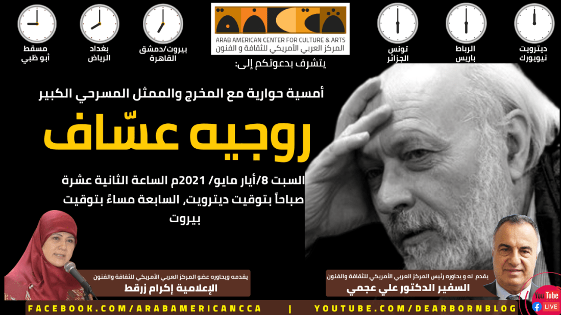 يتشرف المركز العربي الاميركي للثقافة والفنون بدعوتكم إلى أمسية حوارية مع المخرج والممثل المسرحي الكبير روجيه عساف يقدمه ويحاوره السفير الدكتور علي عجمي والسيدة إكرام زرقط الزمان: السبت في الثامن من شهر أيار (مايو)، 2021، الساعة الثانية عشرة ظهرا بتوقيت ديترويت، السابعة مساء بتوقيت بيروت