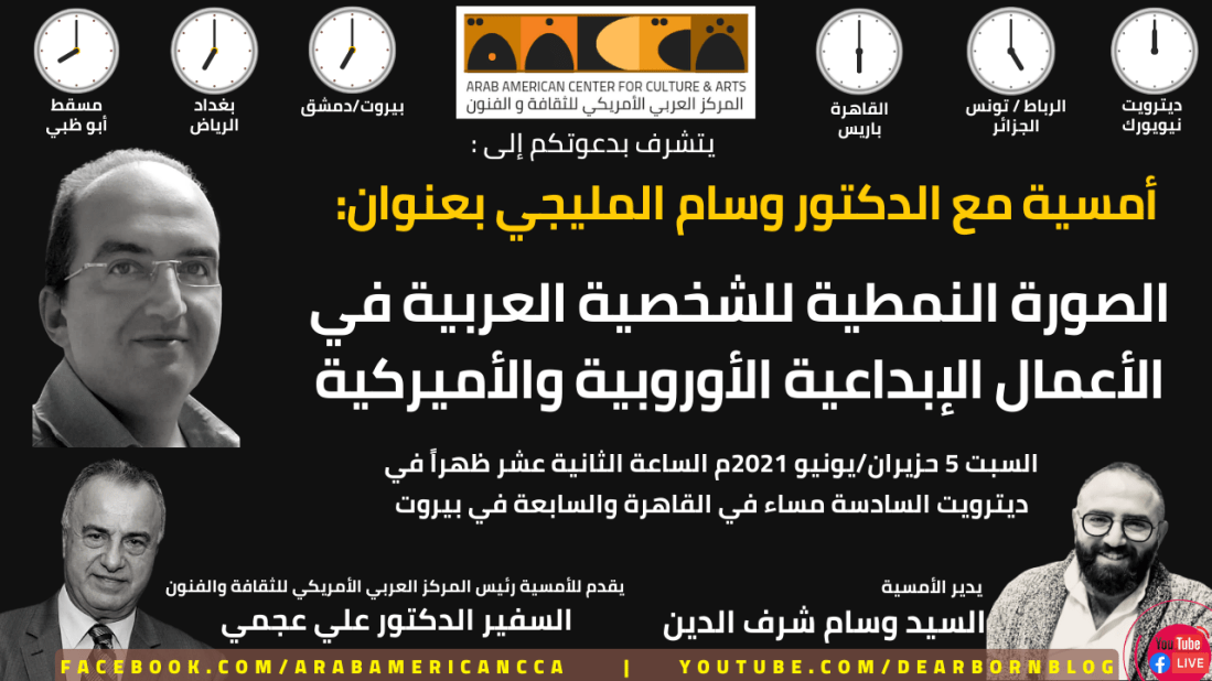 يتشرف المركز العربي الاميركي للثقافة والفنون بدعوتكم إلى أمسية بعنوان: (الصورة النمطية للشخصية العربية في الأعمال الإبداعية الأوروبية والأميركية) مع الدكتور وسام المليجي يقدم للأمسية علي عجمي ويديرها وسام شرف الدين الزمان: السبت في 5 حزيران/يونيو 2021، الساعة الثانية عشرة ظهرا بتوقيت ديترويت السابعة مساء بتوقيت بيروت