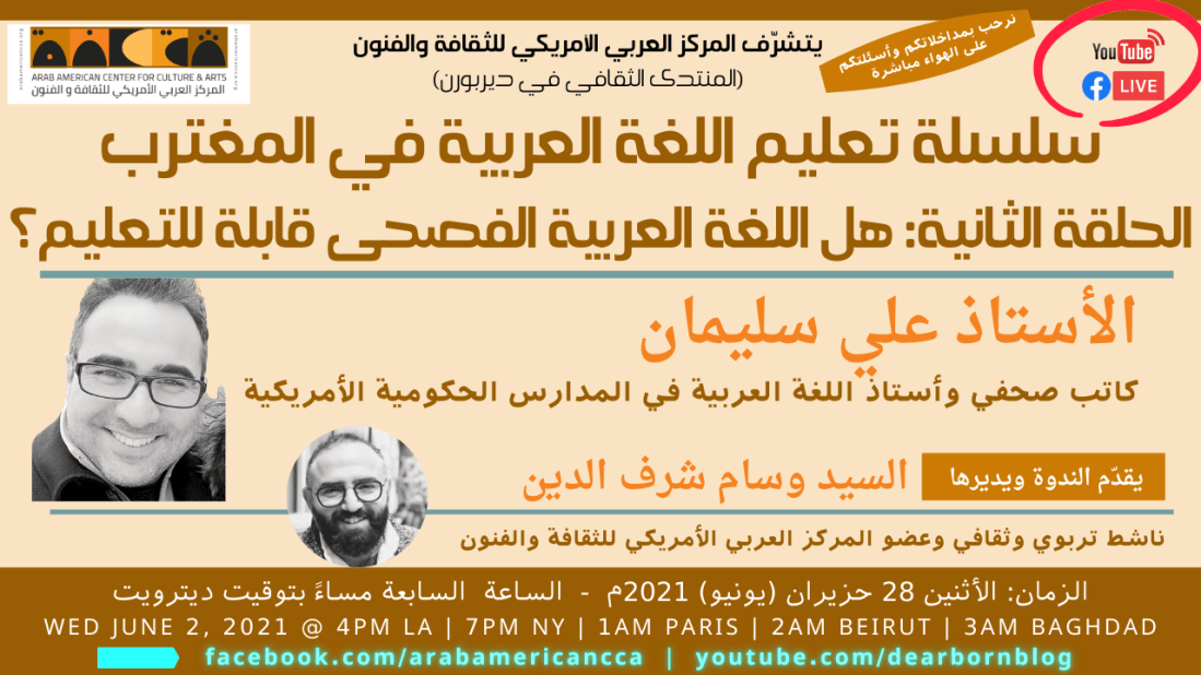 يتشرف المركز العربي الأميركي للثقافة والفنون بدعوتكم إلى الحلقة الثانية من سلسلة تعليم اللغة العربية تحت عنوان “هل اللغة العربية الفصحى قابلة للتعليم” مع الأستاذ علي سليمان، الكاتب والصحفي، ومعلم اللغة العربية والخبير في تعليمها ووضع مناهجها في المغترب.