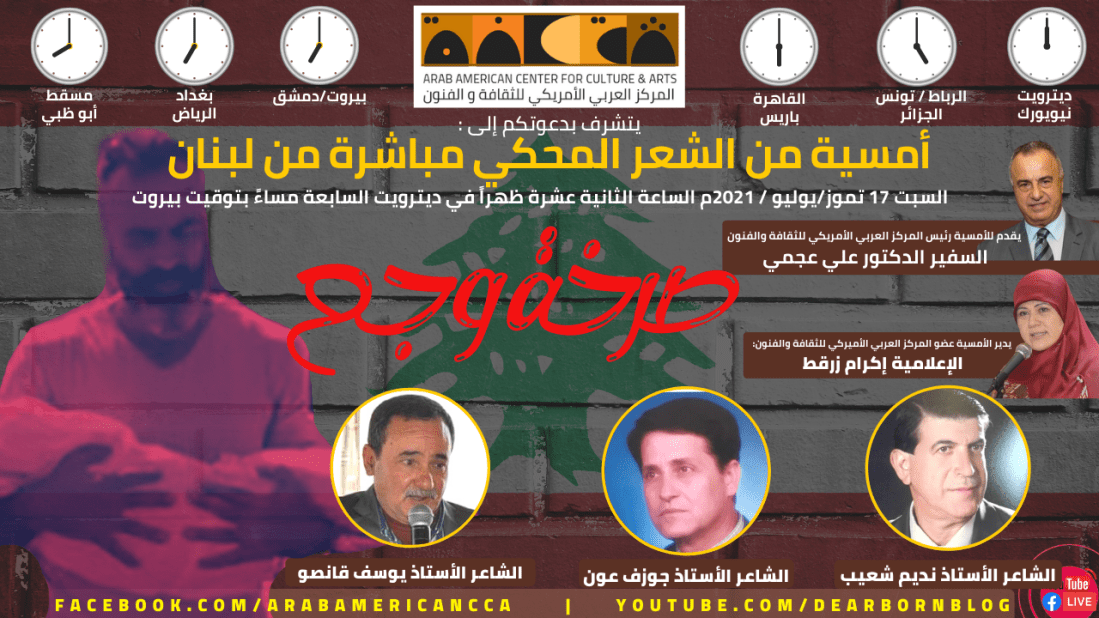 SUBSCRIBEDيتشرف المركز العربي الاميركي للثقافة والفنون بدعوتكم إلى أمسية من الشعر المحكي مباشرة من لبنان، عنوانها: (صرخة وجع) يشارك فيها كل من: الشاعر الأستاذ نديم شعيب الشاعر الأستاذ جوزف عون والشاعر الأستاذ يوسف قانصو يقدم للأمسية علي عجمي وتديرها الإعلامية إكرام زرقط الزمان: السبت في 17 تموز (يوليو) 2021، الساعة الثانية عشرة ظهرا بتوقيت ديترويت السابعة، مساء بتوقيت بيروت