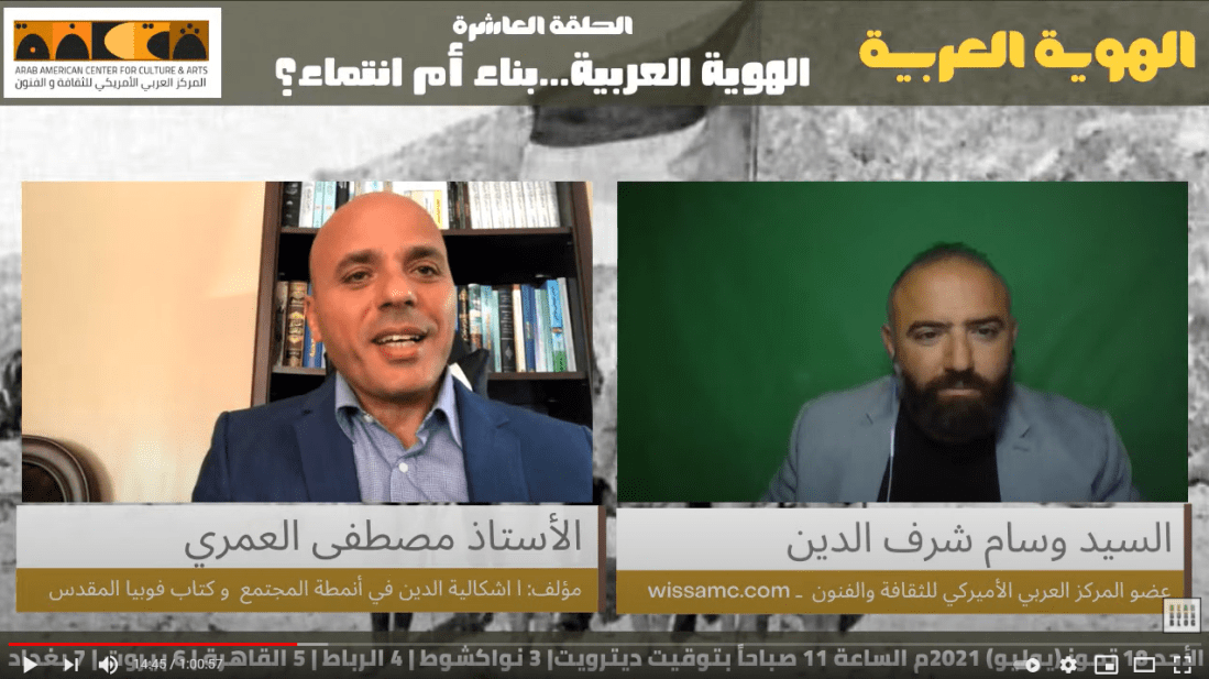 لمركز العربي الأميركي للثقافة والفنون يتشرف لدعوتكم للحلقة العاشرة من برنامج الهوية العربية تقدمة السيد وسام شرف الدين تحت عنوان: الهوية العربية… بناء أم انتماء مع ضيف الحلقة، المفكر والكاتب العربي، صاحب كتاب اشكالية الدين في أنمطة المجتمع و كتاب فوبيا المقدس الأستاذ مصطفى العمري. وذلك يوم الأحد الموافق للـ 18 تموز يوليو لعام 2021م في تمام الساعة الحادية عشر صباحاً بتوقيت ديترويت، السادسة بتوقيت بيروت، والسابعة بتوقيت بغداد.