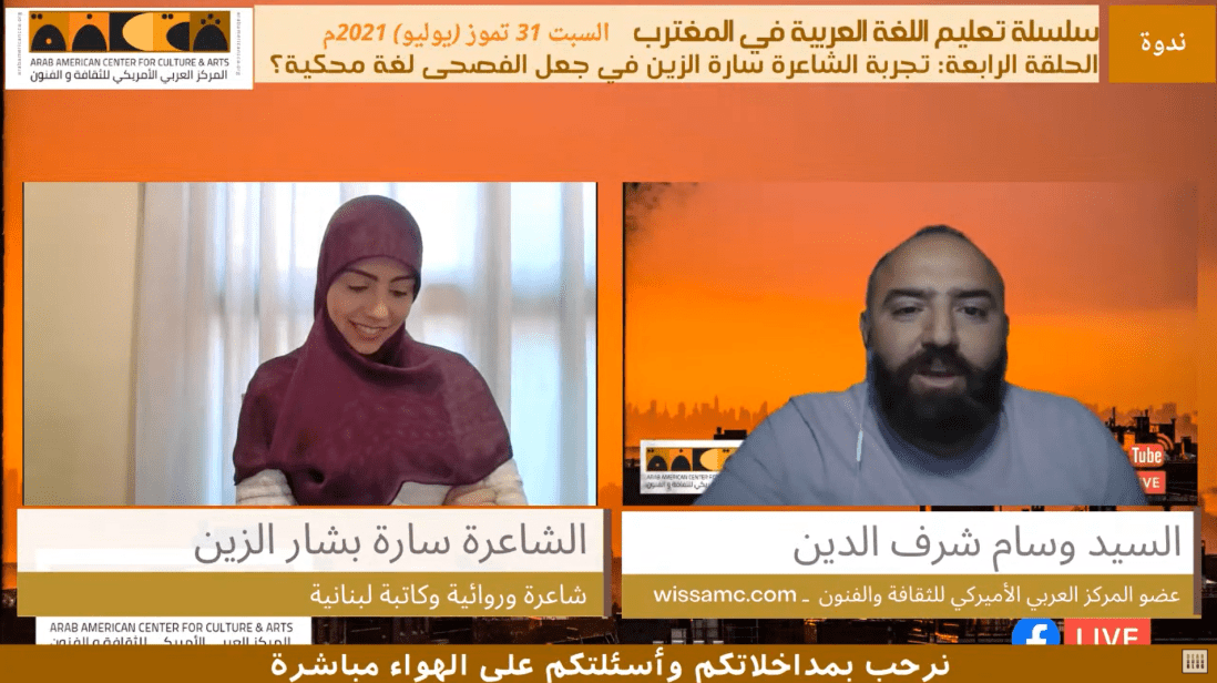 يتشرف المركز العربي الأميركي للثقافة والفنون بدعوتكم إلى الحلقة الرابعة من سلسلة تعليم اللغة العربية في المغترب تحت عنوان: “تجربة الشاعرة سارة الزين في تحويل الفصحى إلى لغة محكية” مع ضيف الحلقة الشاعرة سارة بشار الزين. وذلك يوم السبت الموافق لـ 31 من شهر تموز يوليو لعام 2021م في تمام الساعة الثانية عشر ظهراً بتوقيت ديترويت، السابعة مساء بتوقيت بيروت.