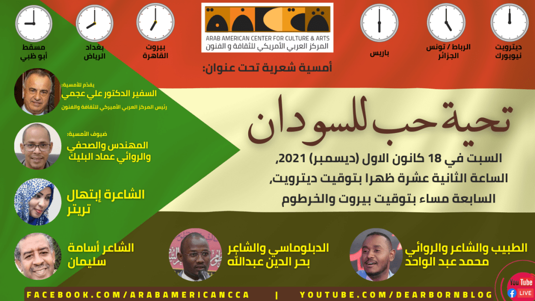 يتشرف المركز العربي الأميركي للثقافة والفنون بدعوتكم إلى أمسية تحت عنوان: تحية حب للسودان يشارك فيها: المهندس والصحفي والروائي عماد البليك الشاعرة إبتهال تريتر الشاعر أسامة سليمان الدبلوماسي والشاعر بحر الدين عبدالله والطبيب والشاعر والروائي محمد عبد الواحد يقدم الأمسية ويديرها السفير الدكتور علي عجمي الزمان: السبت في 18 كانون الاول (ديسمبر) 2021، الساعة الثانية عشرة ظهرا بتوقيت ديترويت، السابعة مساء بتوقيت بيروت والخرطوم