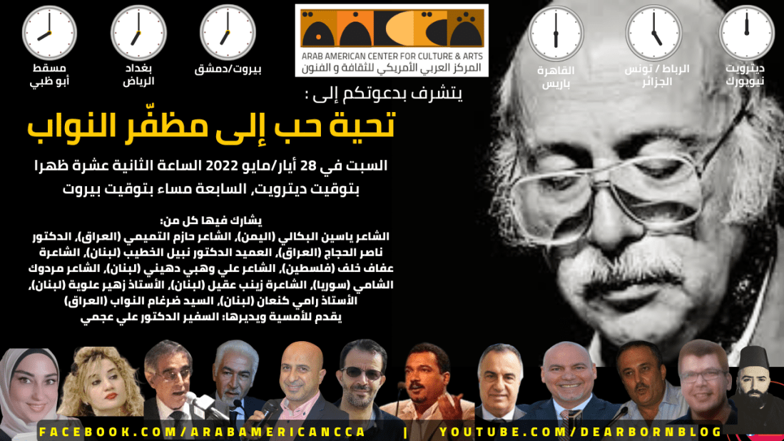 الزمان: السبت في 28 أيار/مايو 2022 الساعة الثانية عشرة ظهرا بتوقيت ديترويت، السابعة مساء بتوقيت بيروت