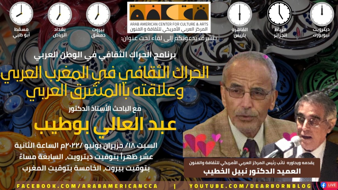يتشرف المركز العربي الأميركي للثقافة والفنون بدعوتك الى لقاء تحت عنوان: الحراك الثقافي في المغرب العربي وعلاقته باالمشرق العربي . ضيف الأمسية الباحث الاستاذ الدكتور عبد العالي بوطيب. يقدمه ويحاوره الاستاذ الدكتور نبيل الخطيب السبت الواقع فيه 06/18/2022 الساعة ١٢ ظهراً بتوقيت ميشيغان / السابعة مساءً بتوقيت بيروت / الخامسة بتوقيت المغرب العربي