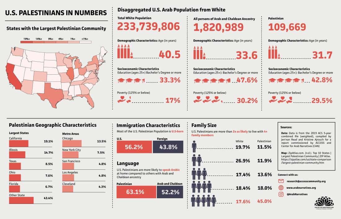 Using the data and analysis from the report, CAN produced a portrait of the Palestinian American community. The portrait shows that Palestinian Americans have large families and retain use of the Arabic language at higher rates than the average Arab American. The infographic is attached here and you can read the Narrative about the Palestinian American experience here: https://www.arabnarratives.org/narratives. To ensure you receive future community profiles using the latest data, please follow CAN on Instagram: https://www.instagram.com/ArabNarratives/