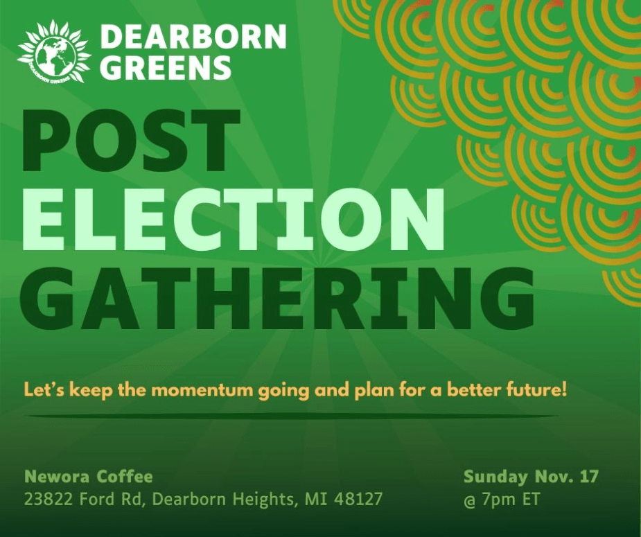 Dearborn was the epicenter of the Stein campaign and it was great working with the Dearborn Greens. They’re hosting a post-election gathering tomorrow 7pm It’ll be a chance to discuss the election and the plans going forward. I’m going! Who else wants to join me?