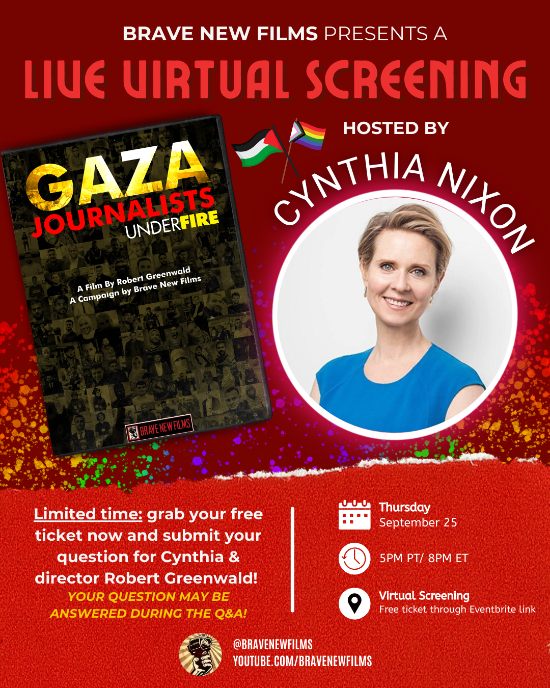 Newsletter subscribers (that’s you!) get first access to tickets for our Live Virtual Screening of Gaza: Journalists Under Fire, hosted by Cynthia Nixon.