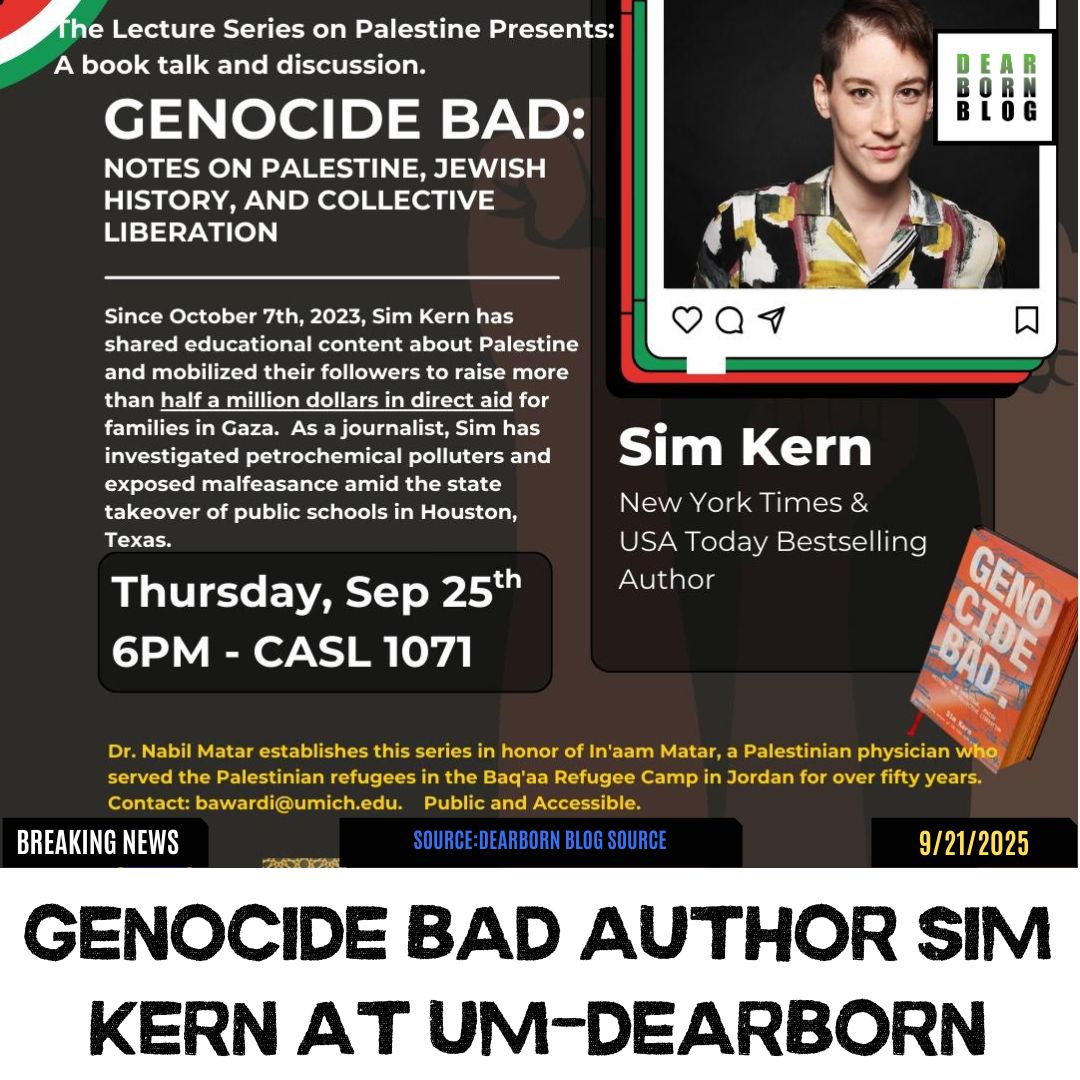 UM-Dearborn hosts Genocide Bad: Notes on Palestine, Jewish History, and Collective Liberation with bestselling author and journalist Sim Kern—a conversation shaped by the city of Dearborn’s Arab American majority, the University’s long-standing scholarship in Arab American studies, and the moral urgency of Palestinian human rights. The evening is organized as part of The Lecture Series on Palestine, curated locally by Dr. Hani J. Bawardi and established in honor of Dr. In’aam Matar, a Palestinian physician who served refugees in Jordan’s Baq’a camp for over half a century (per event materials). It’s an invitation to think clearly, argue honestly, and act with compassion.