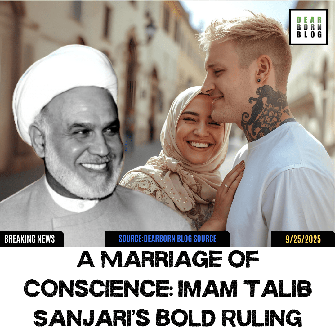In Dearborn’s living rooms and lecture halls, a quiet revolution is underway: Imam Talib Sanjari—a classically trained Iraqi cleric who settled among us—has argued that a Muslim woman may marry a non-Muslim man when justice, dignity, and today’s plural civic realities are honored. His stance challenges a centuries-long consensus, ignites serious debate, and calls us back to a Qur’anic ethic rooted in reason and public good. This essay maps the terrain—what Sanjari actually says, what mainstream institutions still hold, how law and lived life have shifted, and why Dearborn’s conversation matters for human rights and Green values. [1]