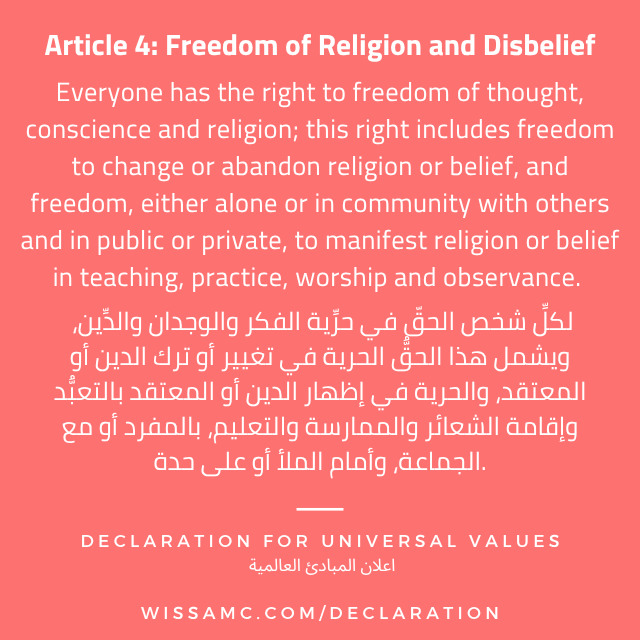 .FridayMusings is pleased to provide our readers with Article 4 – Freedom of Religion from the Universal Declaration of Human Values by Wissam Charafeddine, a Livonia author and lecturer. This article is particularly important with its discussion of defending the dignity of the believer–but the humanity of the doubter.Everyone has the right to freedom of thought, conscience and religion; this right includes freedom to change or disavow his religion or belief, and freedom, either alone or in community with others and in public or private, to manifest his religion or belief in teaching, practice, worship and observance.