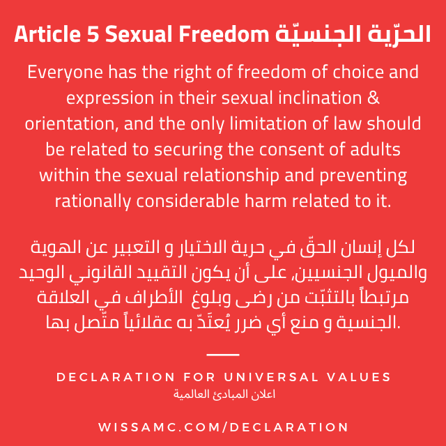 Everyone has the right of freedom of choice and expression in their sexual orientation, and the only limitation of law should be related to securing the consent of adults within the sexual relationship and preventing rationally considerable harm related to it.