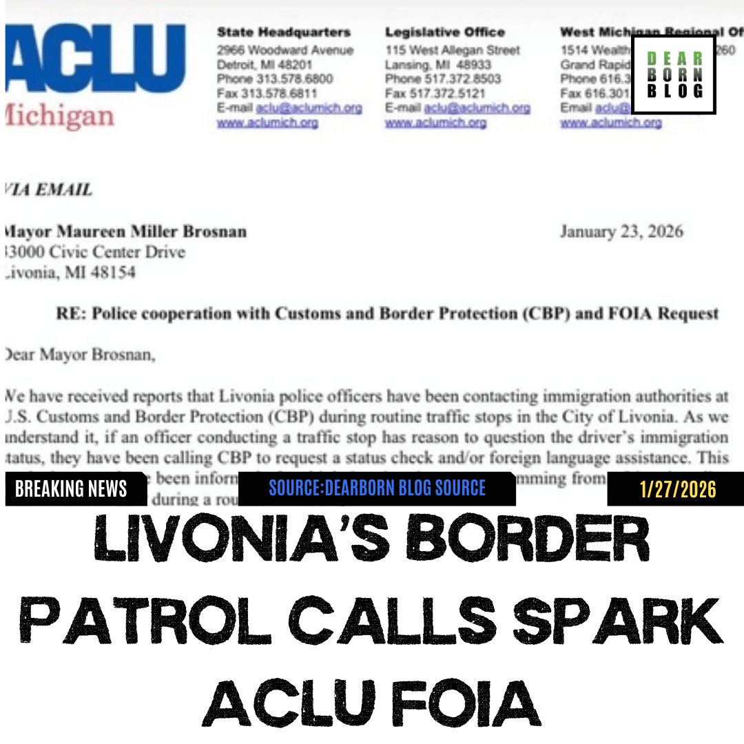 - ACLU of Michigan letter to Livonia Mayor Maureen Miller Brosnan (Jan. 23, 2026), “Police cooperation with Customs and Border Protection (CBP) and FOIA Request.” (Copy provided to Dearborn Blog.)