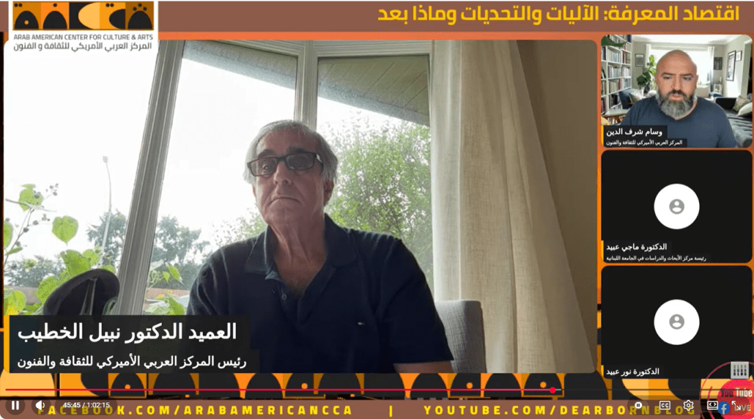 يتشرف المركز العربي الأميركي للثقافة والفنون بدعوتكم لمتابعة ندوة تحت عنوان: اقتصاد المعرفة: الآليات والتحديات، وماذا بعد. إعداد وتقديم: العميد الدكتور نبيل الخطيب، رئيس المركز العربي الأميركي للثقافة والفنون والأستاذ وسام شرف الدين الزمان: يوم السبت في 16 آب (أغسطس)، 2025، الساعة الثانية عشرة ظهرا بتوقيت ديترويت، السابعة مساء بتوقيت بيروت. المكان: منصات المركز الإلكترونية