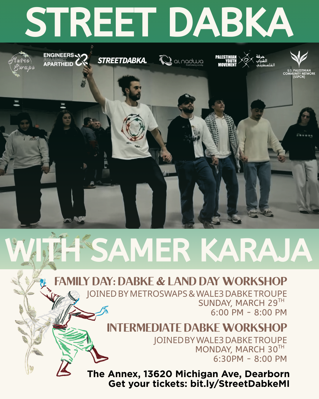 We will be hosting a 2-day Dabke workshop at the Annex in Dearborn on Sunday, March 29th and Monday, March 30th.