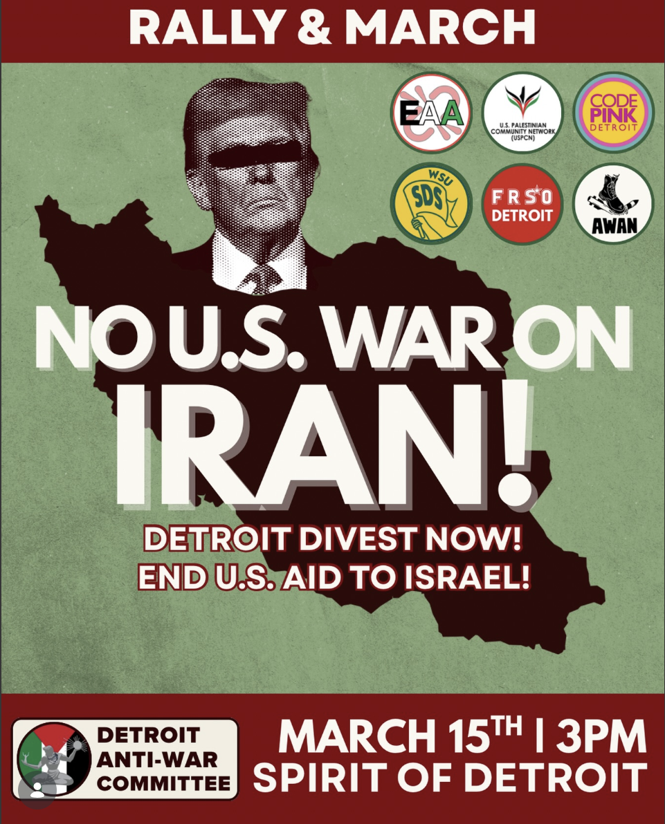 Please join us afterwards at the No War for Iran rally and march at the Spirit of Detroit at 3 pm.
