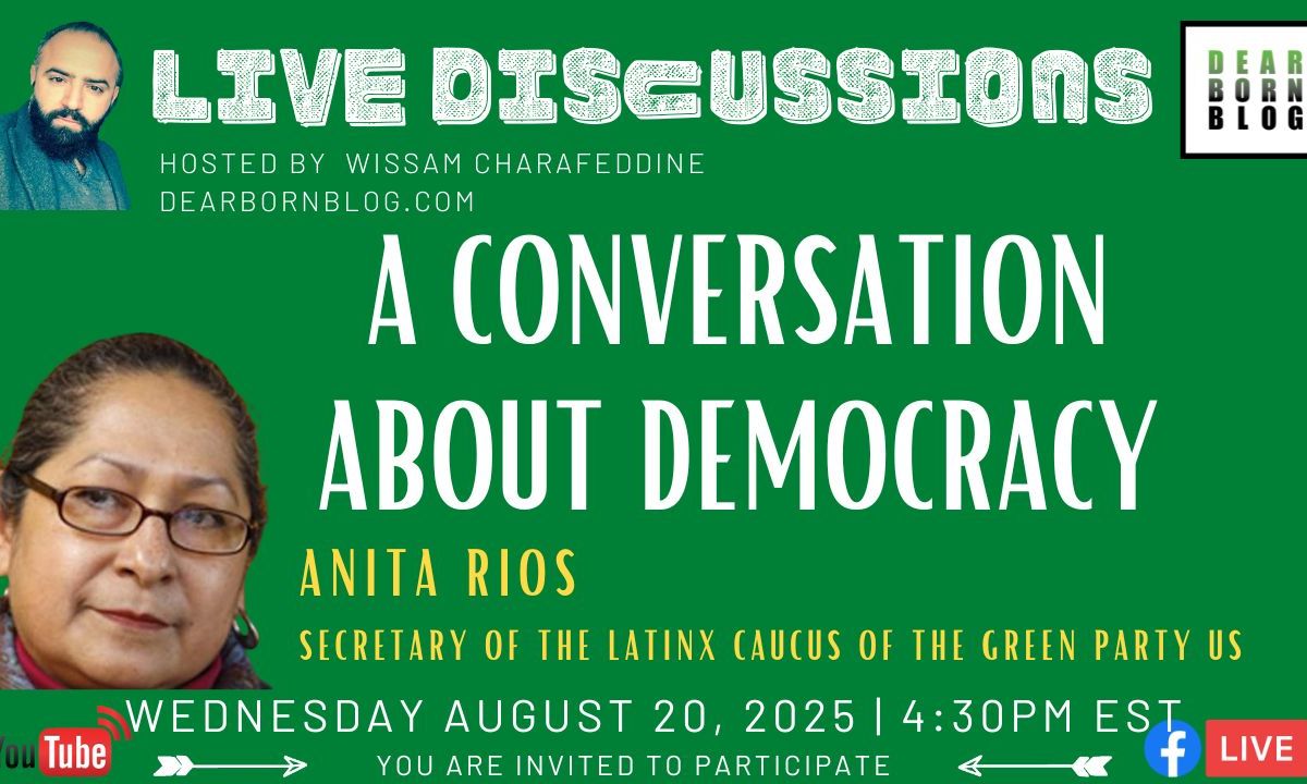 https://www.youtube.com/live/7M5MrFAFWBE?si=yYeXLtnkspH9lDXp Join us on Tuesday, August 5, 2025 at 6:00 PM EST for a special episode of Dearborn Discussions, hosted by Wissam Charafeddine and streaming live on DearbornBlog.com and Facebook Live. We’ll be speaking with Jacqui Deveneau, a veteran activist and a central figure in the Green Party movement in the United States. At 75 ...