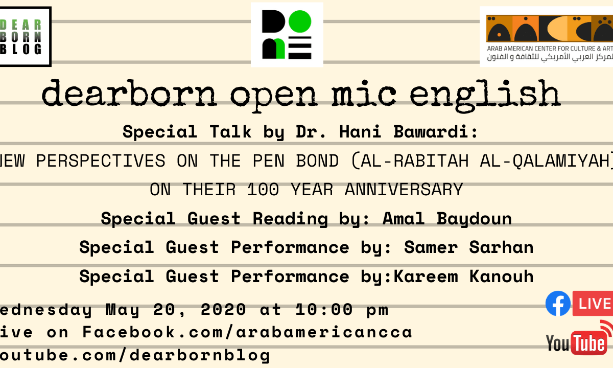 Arab American Center for Culture and Arts invite you for another night of poetry, music, and culture with the Dearborn Open Mic English (DOME) at 10PM on the third Wednesday of each month. This episode on May 20, 2020, will feature a talk by Professor Dr. Hani Bawardi titled "New Perspectives on the Pen Bond (AlRabitah AlQalamiyah) on Their 100 Year Anniversary". It will also feature poetry from Amal Baydoun for the first time. Other poets will participate in the open forum. There will be a special live performance by Samer Sarhan and Kareem Kanouh.