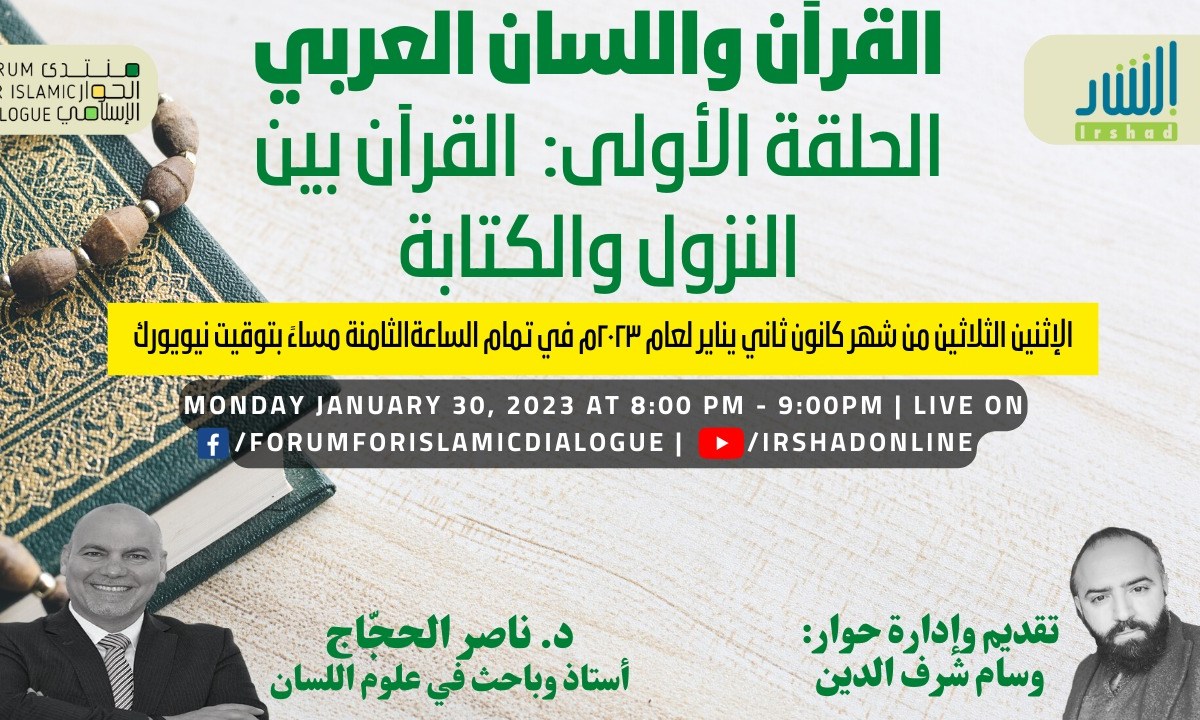 منتدى الحوار الإسلامي بالتعاون مع إرشاد يقدم لكم سلسلة:ـ القرآن الكريم واللسان العربي الحلقة ٢: القرآن بين اللسان واللغة مع الدكتور ناصر الحجاج أستاذ مساعد للغة والثقافة العربية في جامعة مونتانا. باحث ألسني ومصمم مناهج تدريس لعدد من المؤسسات التعليمية ، آخرها منهج تعليم "الفصحى المحكية عن طريق المعايشة اللغوية" كلية كونكورديا يقدم البرنامج ويدير الحوار: السيد وسام شرف الدين يوم الإثنين الموافق للثالث عشر من شهر شباط فبراير عام ٢٠٢٣م الساعة الثامنة مساءً بتوقيت ديترويت ونيويورك للمشاهدة على الهواء مباشرة على *الفيس بوك*: https://www.facebook.com/events/11551... و على *اليوتوب*: https://www.youtube.com/watch?v=3jK93... وللمداخلة المباشرة على الهواء ... سيتم عرض الرابط خلال الحلقة.