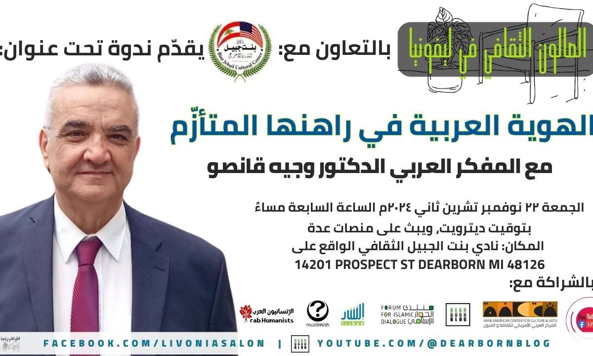 الصالون الثقافي في ليفونيا يقدم: الهوية العربية في راهنها المتأزّم مع الدكتور وجيه قانصو