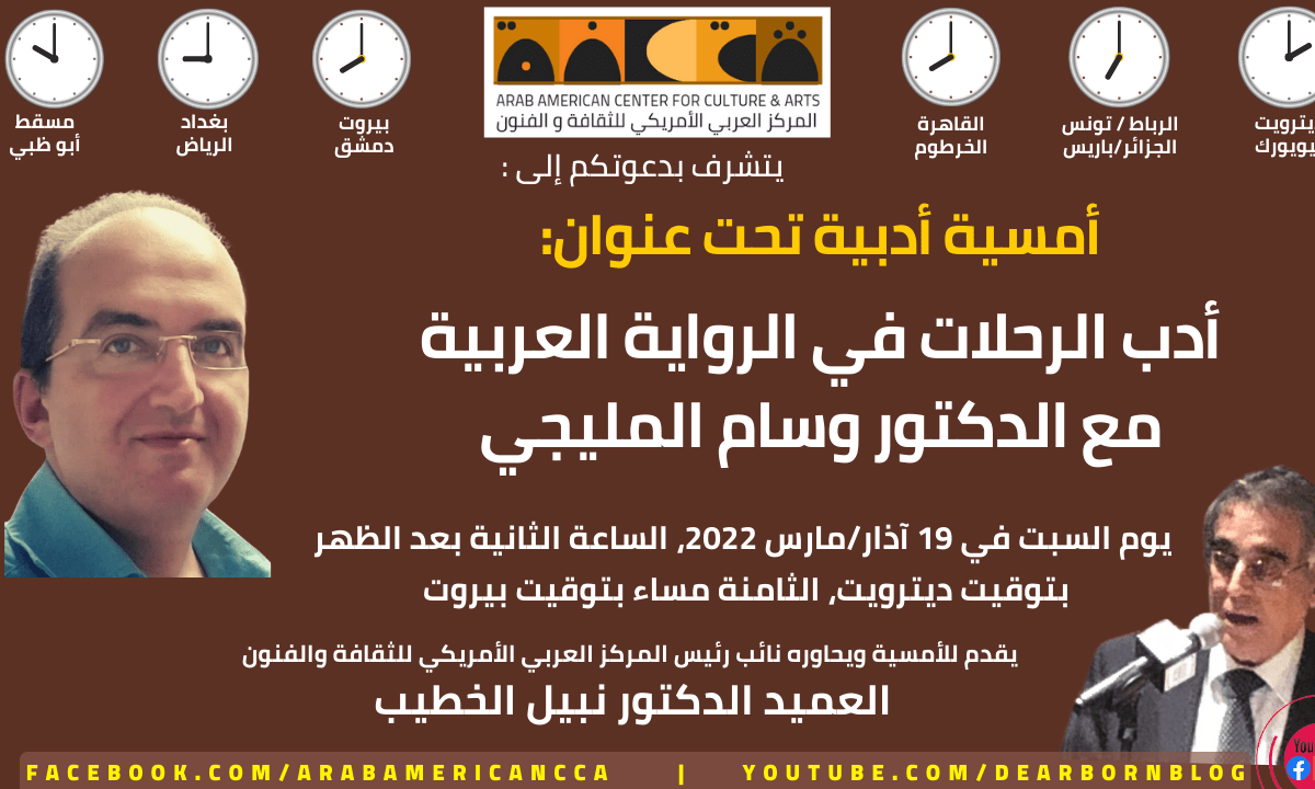 يتشرف المركز العربي الاميركي للثقافة والفنون بدعوتكم إلى أمسية أدبية تحت عنوان: أدب الرحلات في الرواية العربية مع الدكتور وسام المليجي يقدمه ويحاوره العميد الدكتور نبيل الخطيب الزمان: يوم السبت في 19 آذار/مارس 2022، الساعة الثانية بعد الظهر بتوقيت ديترويت، الثامنة مساء بتوقيت بيروت والقاهرة ودمشق وفلسطين، التاسعة مساء بتوقيت بغداد، العاشرة مساء بتوقيت الرياض ومسقط