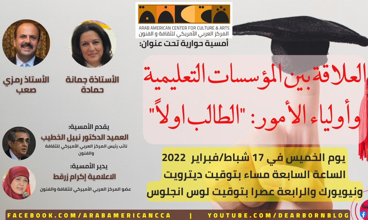 يتشرف المركز العربي الاميركي للثقافة والفنون والمنتدى الثقافي في ديربورن بدعوتكم للحضور افتراضيا إلى لقاء حواري بعنوان: