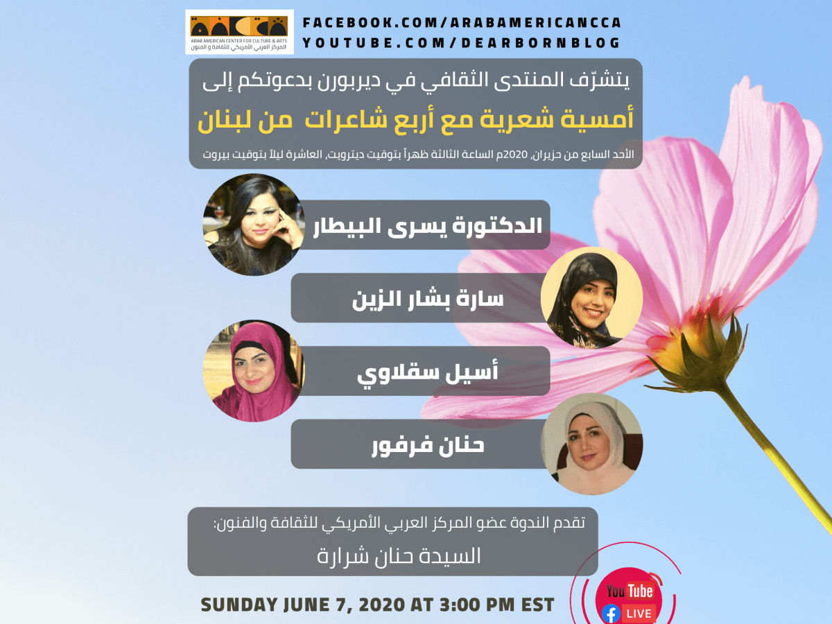 المنتدى الثقافي في ديربورن يقدم: أمسية شعرية من لبنان مع الدكتورة يسرى البيطار، سارة بشار الزين، أسيل سقلاوي، وحنان فرفور [podcast/video]