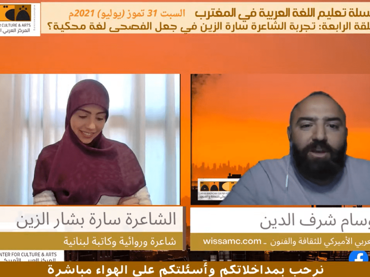 يتشرف المركز العربي الأميركي للثقافة والفنون بدعوتكم إلى الحلقة الرابعة من سلسلة تعليم اللغة العربية في المغترب تحت عنوان: "تجربة الشاعرة سارة الزين في تحويل الفصحى إلى لغة محكية" مع ضيف الحلقة الشاعرة سارة بشار الزين. وذلك يوم السبت الموافق لـ 31 من شهر تموز يوليو لعام 2021م في تمام الساعة الثانية عشر ظهراً بتوقيت ديترويت، السابعة مساء بتوقيت بيروت.