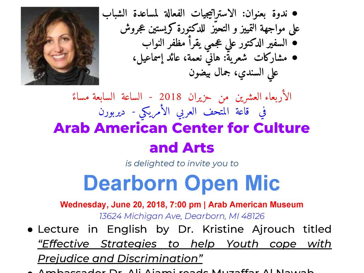المركز العربي الأمريكي للثقافة و الفنون يتشرف بدعوتكم لحضور المنتدى الثقافي في ديربورن ندوة بعنوان: الاستراتيجيات الفعالة لمساعدة الشباب على مواجهة التمييز و التحيّز للدكتورة كريستين عجروش السفير الدكتور علي عجمي يقرأ مظفر النواب مشاركات شعرية: هاني نعمة، عائد إسماعيل، علي السندي، جمال بيضون الأربعاء العشرين من حزيران 2018 - الساعة السابعة مساءً في قاعة المتحف ...